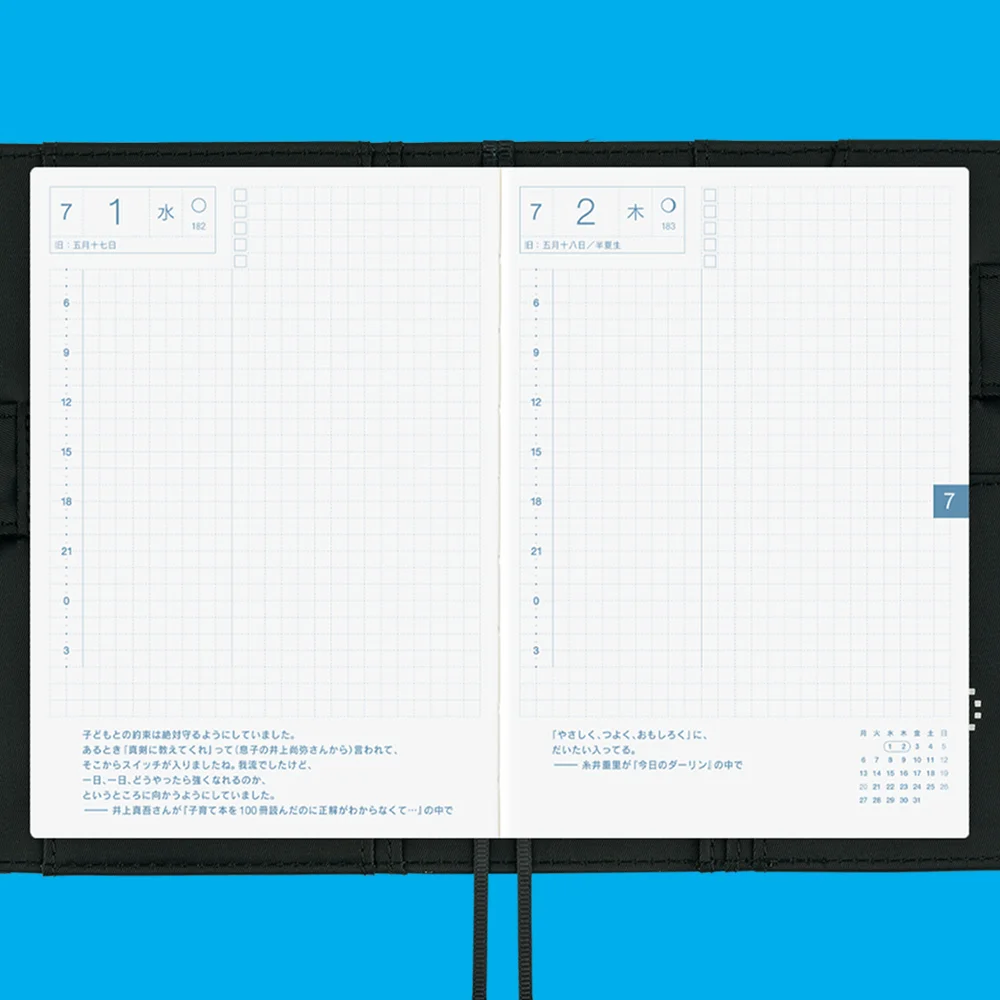 日々起きたおもしろいことを記録する用の手帳はweeks。きれいに使えるようにクリアカバーもプラスしました。