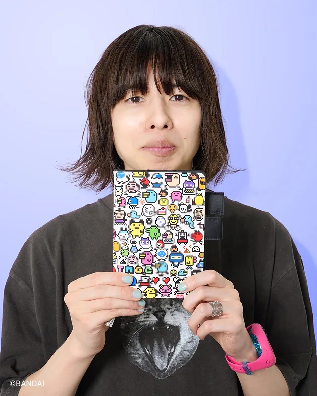 あえて本体もカバーも「柄あり」に挑戦。ドット絵のたまごっちが重なるデザインが可愛くて、見るたびにテンションが上がります!