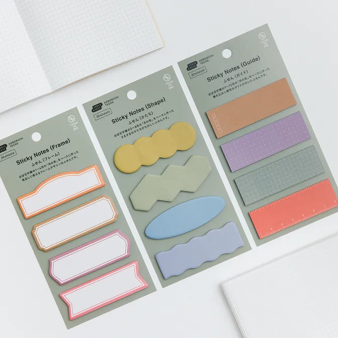 フレームやガイドがデザインされたものや、さまざまなかたちのダイカットタイプなど、使いやすいサイズのふせんです。
