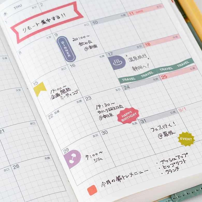月間ページや1日ページに貼って予定を目立たせたり、飾ったりすることができるシール。