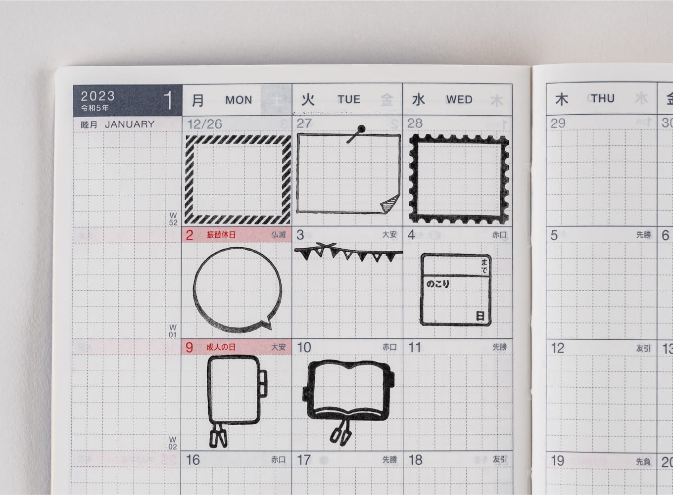 weeksの月間カレンダーのマスサイズにもぴったり。