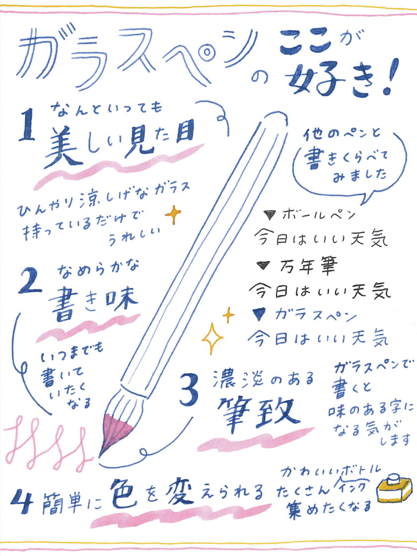 ガラスペンのここが好き! 1なんといっても美しい見た目 2なめらかな書き味 3濃淡のある筆致 4簡単に色を変えられる