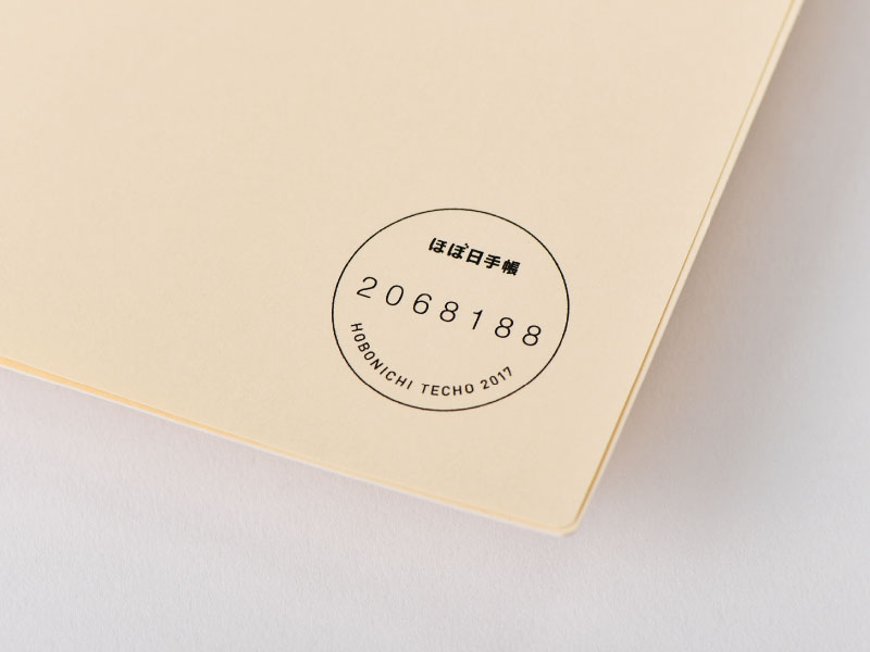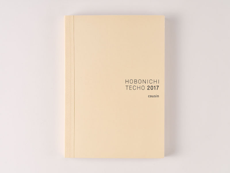 The front of the planner book is made of strong card stock with a soft ivory hue, and features the label “HOBONICHI TECHO 2017 cousin,” printed in gray letters.