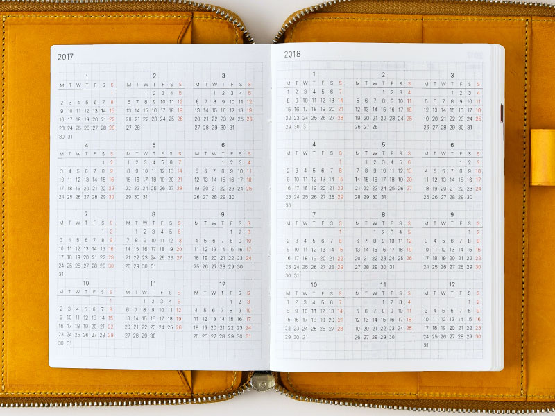 A convenient double-page spread shows the yearly calendars for 2017 and 2018 at one glance as a useful reference when planning ahead. Days are neatly fitted into one square each.