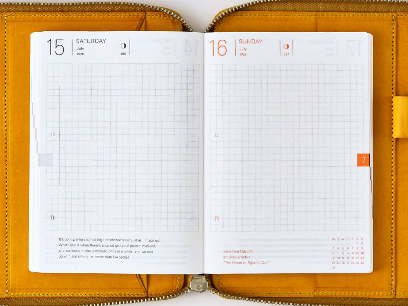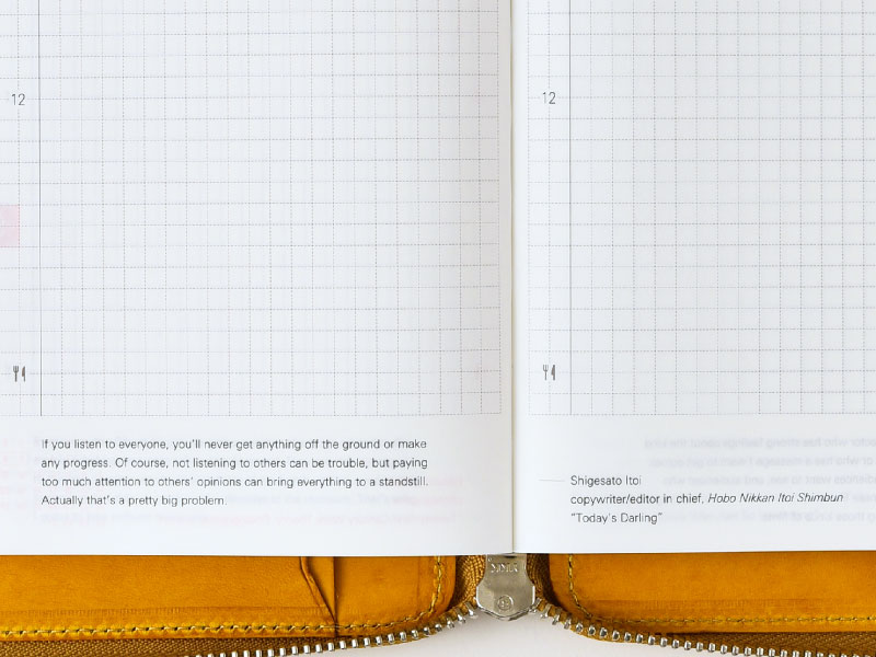 Each spread of the planner features a quote specially selected from the planner's parent site, Hobo Nikkan Itoi Shimbun, and translated into English.