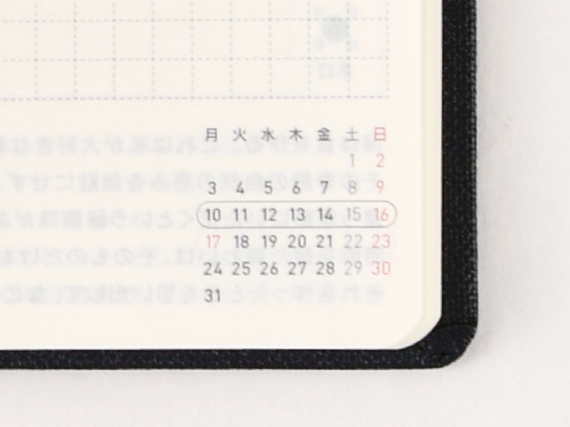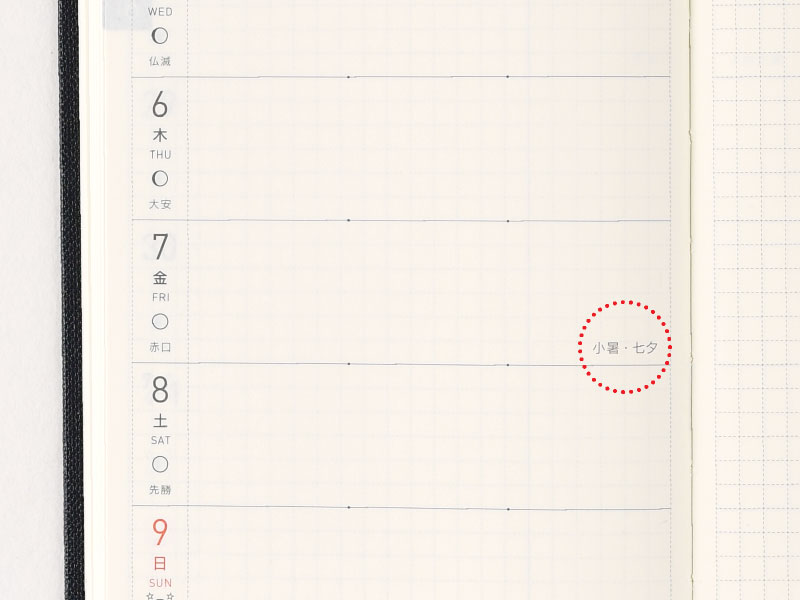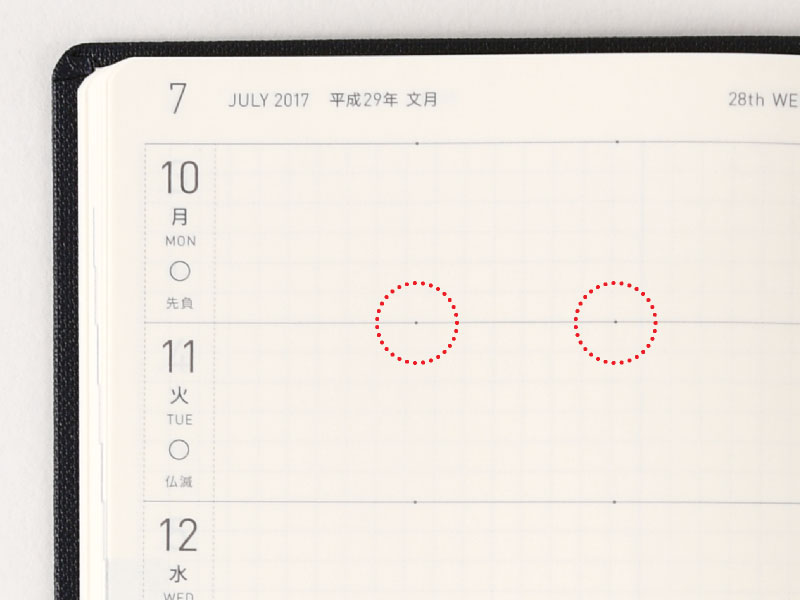 In order to facilitate the most efficient use of the limited space in each day, we've included two subtle dots to split each day into morning, afternoon, and evening. You can use these however you see fit, such as writing plans in the two left spaces and random notes in the one right space, or disregarding the dots altogether.