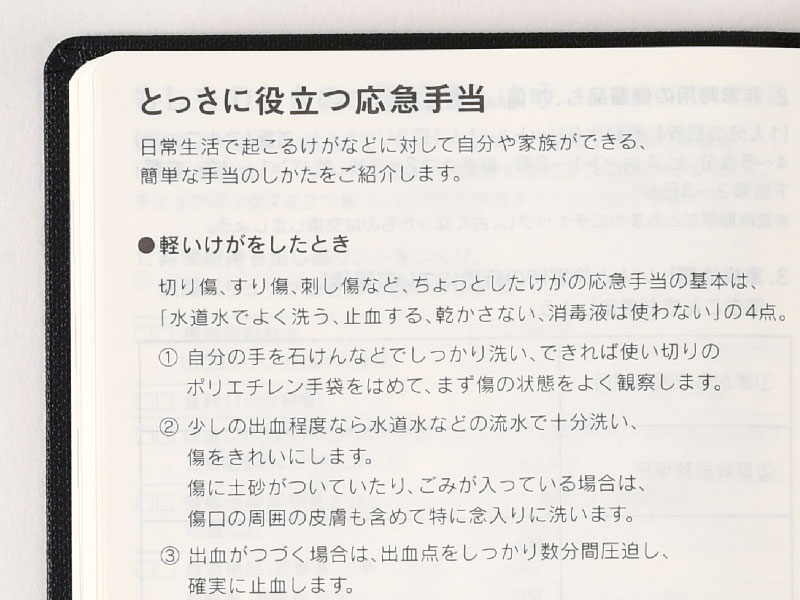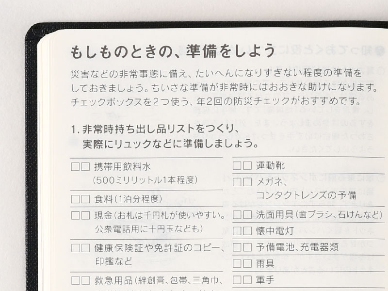 This page contains a checklist of items to have ready in case of an emergency. There is also a space to list nearby evacuation zones (common in Japan), emergency contact information and topics discussed between family and friends.
