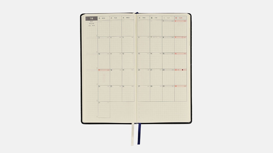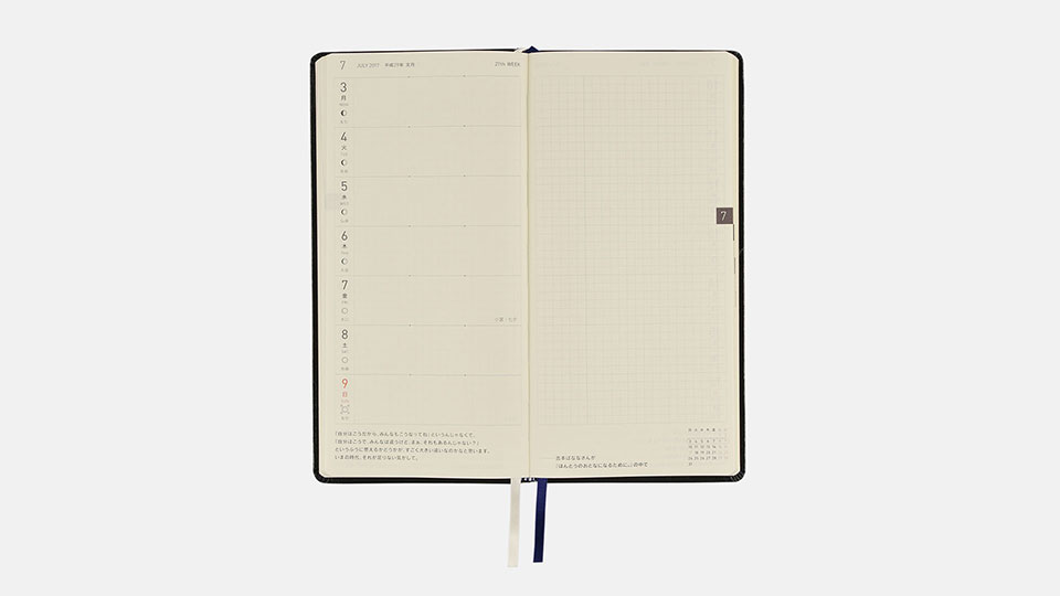 (Specifications may vary slightly)Weight Approx. 133 g Main material Leather Total pages 240 pages Binding Type Stitch-binding Paper Type Tomoe River paper (planner-specific type) Grid size 3.55 mm Yearly Calendar 2016 - 2018 Yearly Index Apr. 2017 - Mar. 2018 (2 pages) Monthly Calendar Mar. 2017 - Apr. 2018 (28 pages) Quotes One per week Weekly Calendar Feb. 27, 2017 - Apr. 1, 2018 (114 pages) Memo Page 76 pages Informational Pages Shorthand Note-Taking / Solar Terms / Favorite Local Japanese Sweets / Interacting with Cats and Dogs / Emergency Preparedness / Useful First Aid Tips / Age Table / Conversion Table / Useful Links / Contact Book / Personal Notes Listed information Week numbers / Rokuyo (Traditional Japanese calendar) / Solar terms (Japanese) / Japanese holidays / Moon phase (weekly pages include daily phase, monthly calendars only include full and new moon)