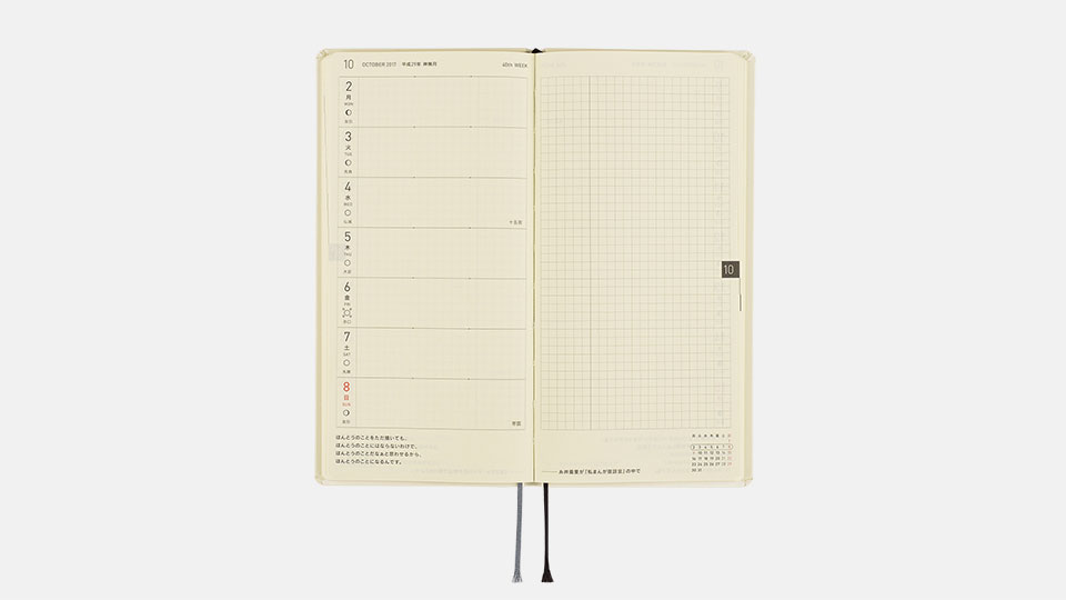 (Specifications may vary slightly)Weight Approx. 138g Main material Rayon Total pages 240 pages Binding Type Stitch-binding Paper Type Tomoe River paper (planner-specific type) Grid size 3.55 mm Yearly Calendar 2016 - 2018 Yearly Index Apr. 2017 - Mar. 2018 (2 pages) Monthly Calendar Mar. 2017 - Apr. 2018 (28 pages) Quotes One per week Weekly Calendar Feb. 27, 2017 - Apr. 1, 2018 (114 pages) Memo Page 76 pages Informational Pages Shorthand Note-Taking / Solar Terms / Favorite Local Japanese Sweets / Interacting with Cats and Dogs / Emergency Preparedness / Useful First Aid Tips / Age Table / Conversion Table / Useful Links / Contact Book / Personal Notes Listed information Week numbers / Rokuyo (Traditional Japanese calendar) / Solar terms (Japanese) / Japanese holidays / Moon phase (weekly pages include daily phase, monthly calendars only include full and new moon)