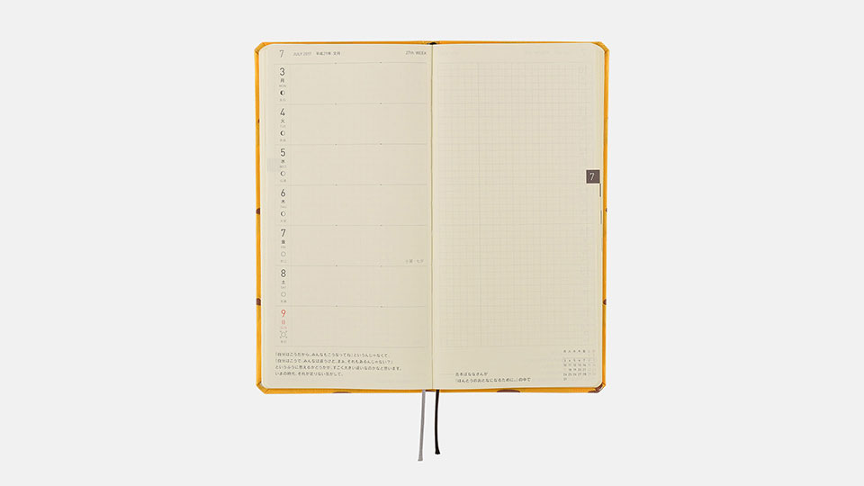(Specifications may vary slightly)Weight Approx. 135 g Main material Polyester Total pages 240 pages Binding Type Stitch-binding Paper Type Tomoe River paper (planner-specific type) Grid size 3.55 mm Yearly Calendar 2016 - 2018 Yearly Index Apr. 2017 - Mar. 2018 (2 pages) Monthly Calendar Mar. 2017 - Apr. 2018 (28 pages) Quotes One per week Weekly Calendar Feb. 27, 2017 - Apr. 1, 2018 (114 pages) Memo Page 76 pages Informational Pages Shorthand Note-Taking / Solar Terms / Favorite Local Japanese Sweets / Interacting with Cats and Dogs / Emergency Preparedness / Useful First Aid Tips / Age Table / Conversion Table / Useful Links / Contact Book / Personal Notes Listed information Week numbers / Rokuyo (Traditional Japanese calendar) / Solar terms (Japanese) / Japanese holidays / Moon phase (weekly pages include daily phase, monthly calendars only include full and new moon)