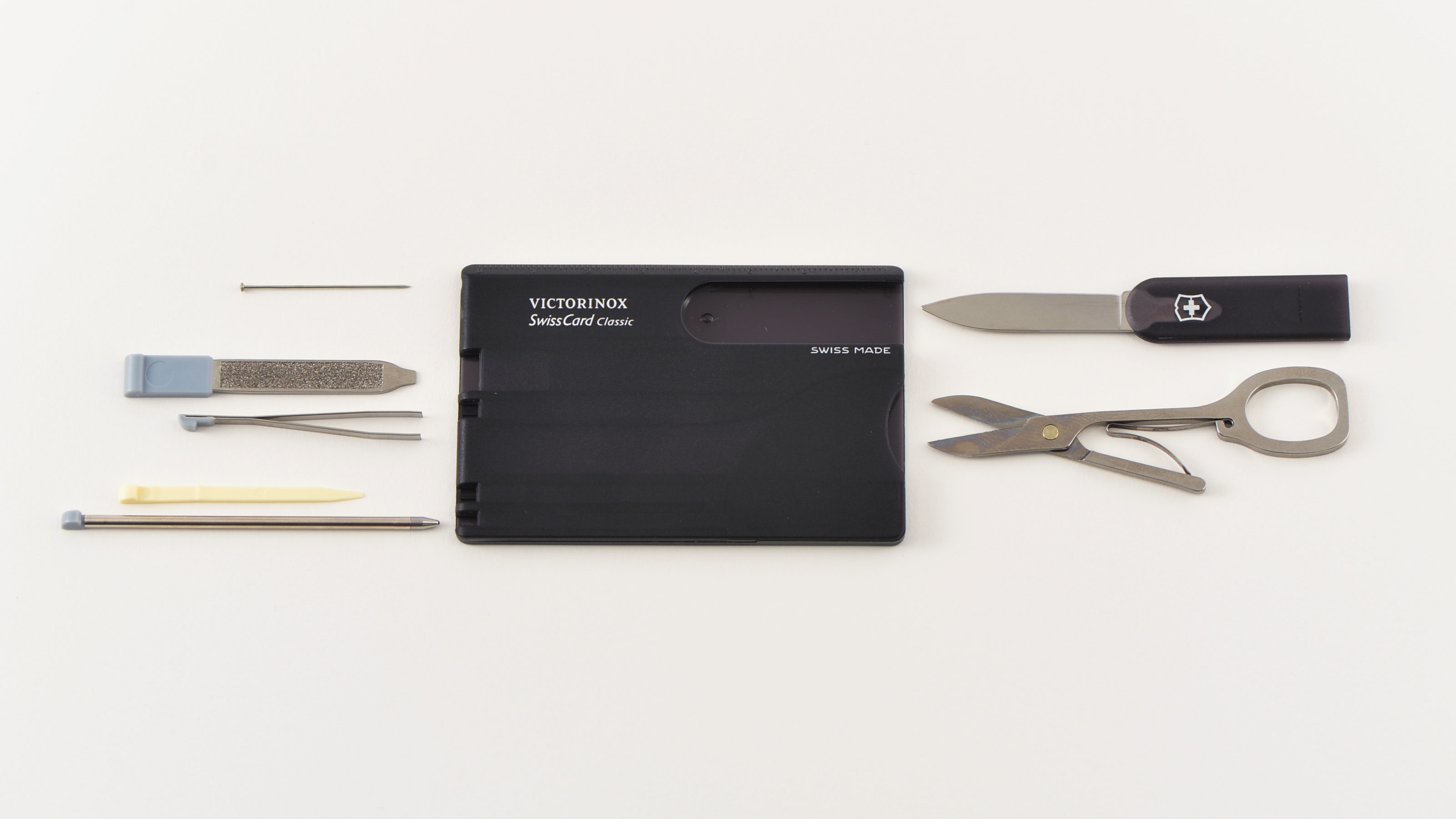 This card-shaped 10-function tool fits perfectly into a planner cover pocket. The card is only 4 mm thick, but it contains such tools as a scissors, letter opener, tweezers, ruler, mini ballpoint pen, nail file, pin, flathead screwdriver, and toothpick. The knife and scissors cut very efficiently thanks to its sophisticated construction by famous Swiss Army Knife manufacturer Victorinox.