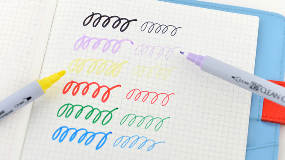 This set of water-based markers has a thick and thin nib on either end and writes in incredibly smooth, vivid ink that feels great to write with. Hobonichi Editor-in-Chief Shigesato Itoi is also a big fan of this set and often uses it to write down random thoughts. The ink does not bleed through the page, but when writing with the thick nib, ink takes a little time to dry.