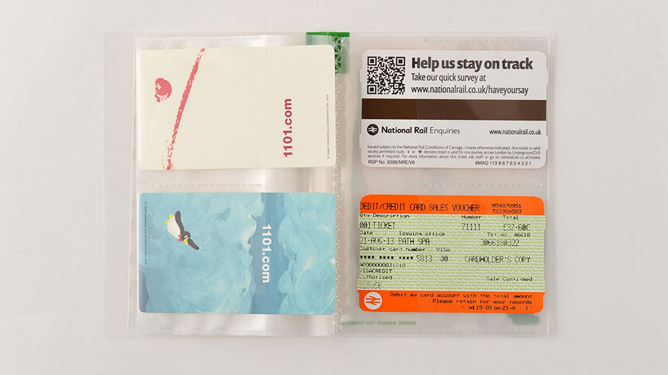 This card case holds up to 32 cards, such as point cards, business cards, or any small clippings or stamps. The flap allows it to fit perfectly into the Hobonichi Techo cover. The first and final pages are larger-size pockets to store items slightly larger than standard card size.