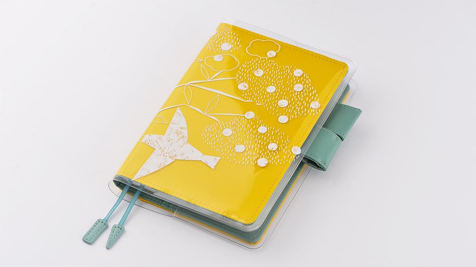 This is the decorated version of the Cover on Cover, an optional, extra covering that fits select Hobonichi Techo covers to protect them from wear and tear while instantly giving the cover a fresh new look. (Not for use directly on book.) It also provides a place to store postcards, pictures, and other decorations to spruce up the look of your cover. Feel free to store family pictures, travel postcards, and other decorations inside the Cover on Cover for additional customization.