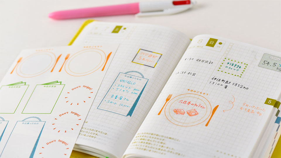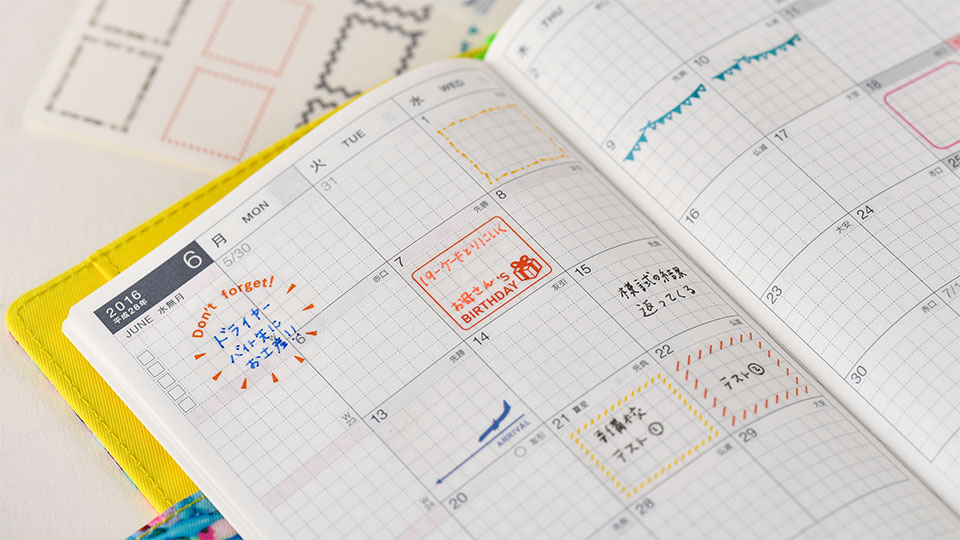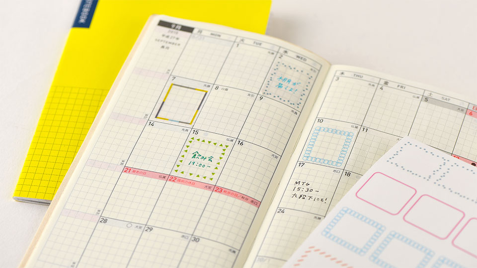 This set of frame stickers is designed to perfectly fit the Japanese A6 Hobonichi Techo Original monthly calendar. The stickers come in several designs to make your pages pop. Stickers also come in larger “daily page” sizes to fit frames onto the daily pages.