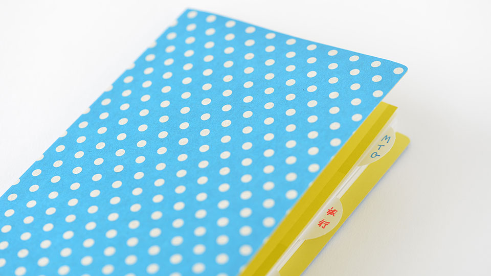 This 40-sheet notebook, designed in collaboration with stationery brand Mizushima, comes in A6 Planner / Original or A5 Cousin size with a choice between plain or graph paper. Polka Dot covers contain plain paper and Striped covers contain 3.7mm graph paper, the same grid size as the Japanese A6 and A5 Hobonichi Techos. Half-circle perforations are cut down the edge of the page for the option of punching in the tab and folding it out to stick out from that page, making a convenient, built-in index. Once you no longer need an index tab for that section, simply fold the tab back into place. The notebook cover is slightly larger than the pages in order to protect the index tabs. Use these notebooks for information that can be organized into themes, such as a studying notebook or a book of recipes.