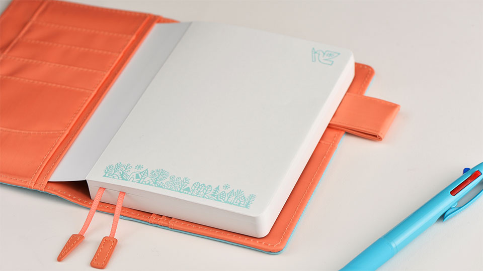This notepad is 155 pages and the same size as the A6 Hobonichi Techo Planner / Original books, so it fits perfectly into planner covers. The paper inside is blank except for a light blue illustration, and the pages are glued in instead of sewn, making them very easy to rip out for shopping lists or passing along messages.