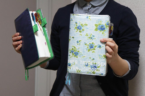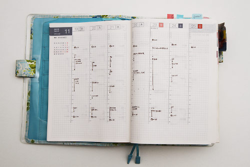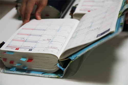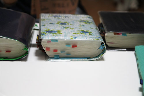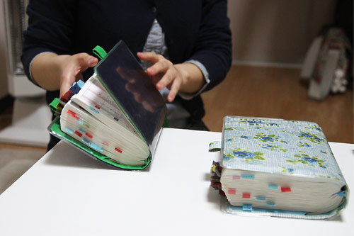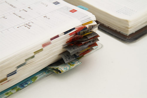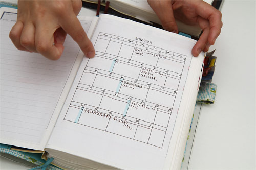 2012年の手帳を開いてもらったところ。通常の3倍くらいの厚さ。