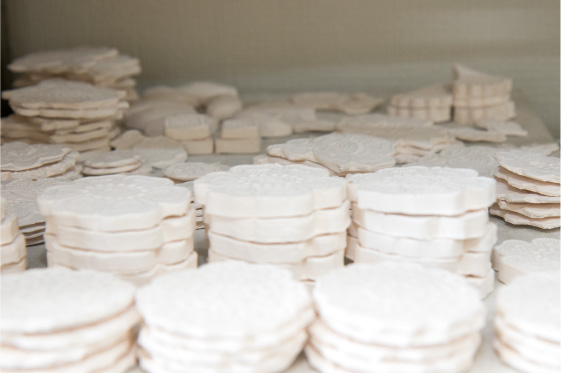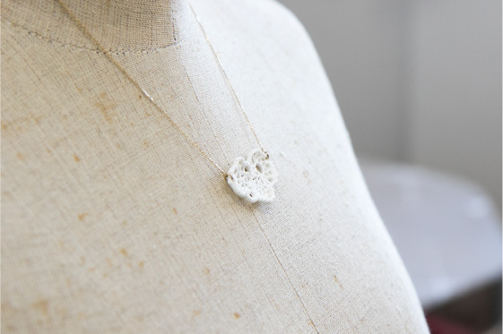 繊細な白磁のブローチ、ピアス、ネックレスなどを