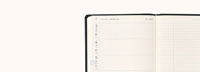 「週間予定+メモ」のページは、左ページに週間予定、右ページに方眼メモという「レフト式」のデザインです。予定の把握しやすさと、メモのとりやすさの両方を兼ね備えた、使いやすいレイアウトです。