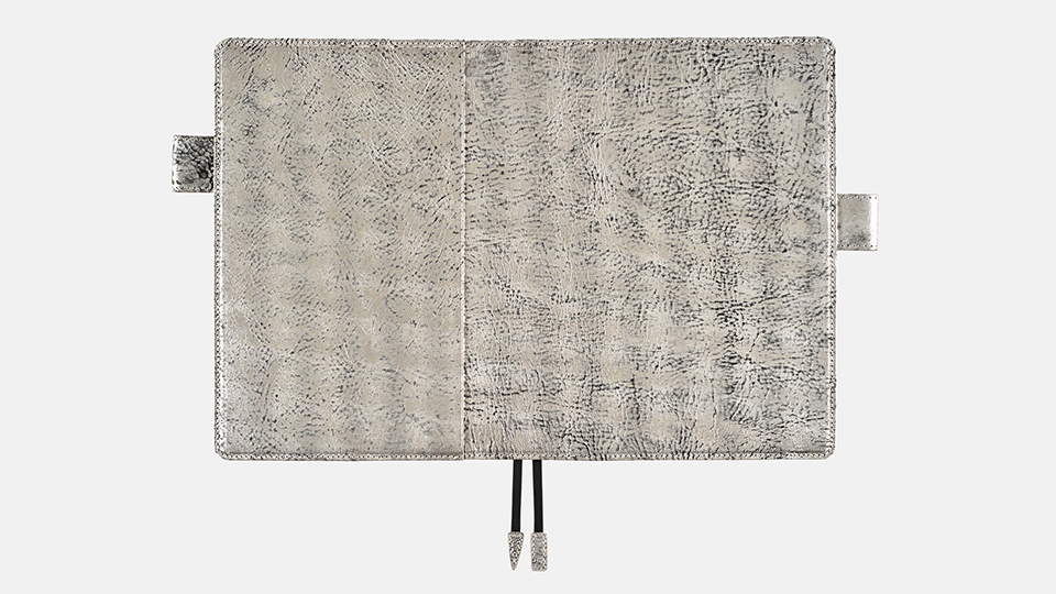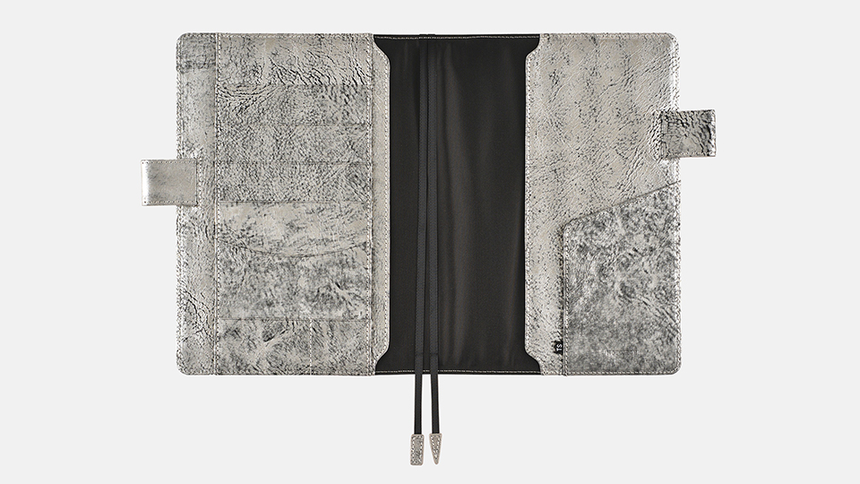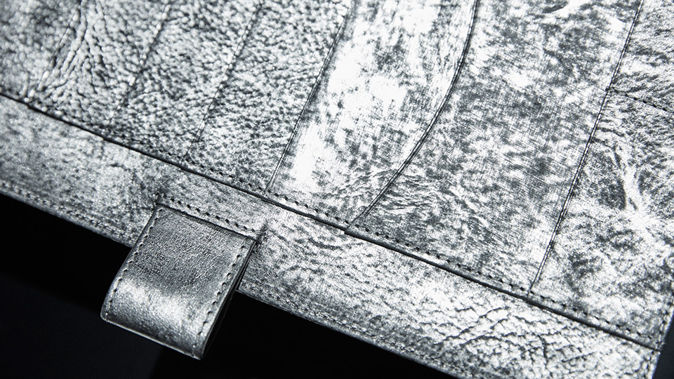 シルバーの箔づけをほどこしたイタリアの革、