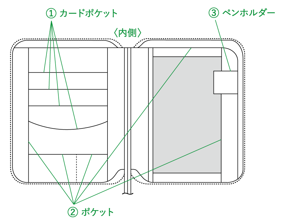 あらかじめご了承ください。- 「外側のポケット」はついていません