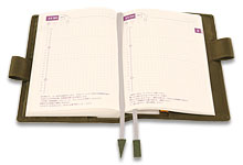 ■読む手帳! 1日1ページのスケジュールページには、 ほぼ毎日、いい言葉が載っています。 セフティマッチ氏の言葉や デリバリー版の“なごみとホロリ” “言いまつがい”“先輩ことば”、 そして、「ほぼ日」からは、 今日のダーリン、ダーリンコラムからはじまって、 ピーコさん、横尾さん、綾戸智絵さん、天海祐希さん、 ズーニー先生、松原耕二さん、清水ミチコさん、 矢沢永吉さん、小野田寛郎さん、ガンジーさん、 コートドールの斉須政雄さん、ゆーないとさん。 そして、コンビニ哲学、2丁目、まるはがまで、 日々、いい言葉に出会えます! ■毎日が記念日! 1日1ページには、 毎日にタイトルとか記念日をつけるための “思い出のタイトル”という欄をつくりました。 そこに、日々の小さな目標や、きょうの出来事などを 書いていただいたりして、 ときどき過去のページをめくりながら、 「この日はこんなことがあったんだ!」 なんて振り返ったりしても、楽しいですね。 |