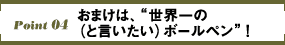 おまけは、なんと “世界一の(と言いたい)ボールペン”! 「ほぼ日手帳2003」をご購入してくださったみなさまに、 もれなく、ほぼ日オリジナルデザインの “おまけの3色ボールペン”がついてきます。 このボールペーン、 おまけにしておくのはもったいないくらいの ボールペンです。 とにかく、“書きやすい!”のです。 その秘密は、油性なのに、 水性のようななめらかな書き味で、 力を入れず、すらすら書ける、オリジナルのインク。 インクがにじむという問題もほとんどないんですよ。 そして、ペンの先が“ニードル(針)型”なので、 インクがかすれにくい! さらに、このボールペン、赤・青・黒の3色なんだけど、 一番多く使う “黒”が2本分入って、 なんと、4本分、入ってるんです!! 黒は、0.5ミリのものと0.7ミリのものの2種類ですので、 ふつうに書くときは、0.7ミリを、 細かい字を書きたいときは、 0.5ミリの“極細”の方を使ってくださいね。 「オートボールペン」さんの大傑作です。 |