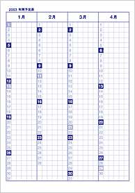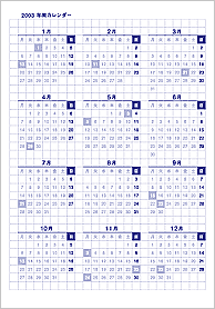 ■アドレス帳は、別冊になります! 別冊ですので、 持ち歩きたい人は、手帳カバーのポケットにはさみこんで、 あまり使わない人は、お家に置いておけますし、 2003年が終わっても、 この住所録だけは、永久保存版にできますよね。 また、去年は「数の少ない住所録」として、 ほんとうに大切な人の連絡先だけを記そうという コンセプトでしたが、 今年は、とっても仲のいい人からちょっと仲のいい人まで なんと、180人もの人の連絡先を 書き込めるようになりました!! ■年間カレンダー&年間予定表を入れました! 1年間のカレンダーをぱっと見たいときに、 “年間カレンダー”のページがあったら、 とっても便利です。 また、“年間予定表”も、 一年間の大きな流れを把握することができる すぐれたページです。 “免許の更新”とか、“定期検診”とか、 “大事な人の誕生日”など、 大きな出来事を記しておけば、 「あ、来月は、○○があるんだ!」と あらかじめ忘れずに心に留めておくことができますね。