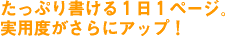 1日1ページに、新たに、 “TO DOリスト”のチェックボックスを設けました。 「今日、やるべきこと」をここに書いて、 できたものからチェックボックスに印をつけていくと、 達成感があって、とっても気持ちがいいんですよね。 「やるべきことリスト」としてだけでなく、 「お買い物リスト」なんかにも便利なんですよねー! こちらも、ジャマにならないように、 右上にさりげなく配置しました。 |