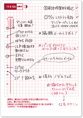 時間軸も、よりスケジュール管理しやすいように、 バージョンアップしました。 2003年度は、1時間ごとに目盛りを振っていましたが、 今年は、時間の目盛りが3時間ごとになったことで、 升目にとらわれず、 より自由にスケジュールを記入することができ、 30分単位・10分単位の細かいスケジュールまで、 記入しやすくなりました! また、朝の6時から翌朝5時までの予定を書き込めるから、 それぞれの方々の時間に合わせて、 仕事も、仕事終了後のスケジュールも たっぷり書き込めます! |
