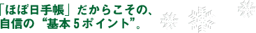 「長所を伸ばして、欠点を克服」という基本方針は、 今年も、もちろん生きています。 「ほぼ日手帳」だからこその“長所”はそのまま、 自信を持って、2004年も変えていません。 では、変えないことについてのお知らせです。 1.軽くて、じょうぶで、見た目にもきれいな あのナイロン素材です。 ちょっと光沢があって、事務用品の店だけでなく、 洋服屋さんや雑貨屋さんに置いてあっても 違和感がまったくありません。 カジュアルだけど、おしゃれなかっこよさです。 しかもこのナイロン素材の大きな特長は、 乱暴に扱っても汚れにくいし、傷つきにくい! 軽くて、毎日持ち歩くのに、便利! ということです。 毎日、持ち歩く手帳だからこそ、 大事なポイントですよね。 とても好評だったので、これは素材はそのまま。 (でも、さらにちょっとよくなってるんですけどね) 2.手になじんで、持ちやすい! いまではもう「伝統」の“文庫本サイズ” 「ほぼ日手帳」のサイズといえば、文庫本のサイズです。 手にすっぽりおさまって、 ジーンズのうしろポケットにも入るし、 持ち歩きやすい、とても便利なサイズなんです。 お財布がわりにカードやお札を入れた手帳を 1冊だけ持って、気軽にお出かけするときにも最適です。 重さは、カバー+本体あわせて265グラムで、 本体は、たて15cm×よこ10.5cm、厚さ1.2cm、 カバーをつけると、たて16.6cm×よこ12cmです。 このサイズも、大好評につき変えませんでした。 |