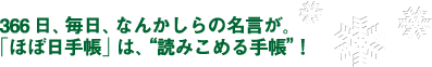 「ほぼ日手帳」のいろんな特長のなかでも、 もっともご支持をいただいているのが、 この、1日1ページの下の言葉なのかもしれません。 昨年までは、“ほぼ毎日”の掲載で、 ときおり、空欄の日があったりしましたが、 今年は、366日、毎日、 数々の名言や迷言が載っています! 文字通り“読みこめる手帳”になりました。 誰かと待ち合わせの時間に、本のように読んだり、 電車の中で、ひまつぶしに読んだり、 つらいときやサミシイときに、 ともだちに会うように読んだり、 それぞれの読み方をしてくださっているようです。 うれしいですねー。 手帳の下の言葉は、 セフティマッチ氏の言葉をはじめとして、 デリバリー版からは、“先輩ことば”、 “言いまつがい”“ナゾ療法”など。 そして、「ほぼ日」からは、 今日のダーリン、 ダーリンコラムからはじまって、 藤田元司さん、 小野田寛郎さん、 保坂和志さん、 岩井克人さん、 MAYA MAXXさん、 米原万里さん、 コートドールの斉須政雄さん、 ズーニー山田さん、 ゆーないとさん、 日々格言、 そして、「ガキバカ」、 「まるはが」もくわわって、 ときに笑い、ときにホロリとしたり。 日々、いろんな言葉に出会える手帳なんです!! そして、さらに、今年は、 「毎月、10日は、なぞなぞの日、 20日は、なぞなぞの答えの日」 として、なぞなぞを掲載しますよ! 「ほぼ日」ではすっかりおなじみの、 「なぞなぞといえば‥‥」の フジモトマサルさんが、 「ほぼ日手帳」用に、 書き下ろしてくださった新作ぞろいです! お友だちに、問題を出したりして楽しんでくださいね。 |