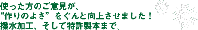 ナイロン素材は、多少乱暴に扱っても、 傷がつきにくく、気軽に持ち歩けるという 大きな特長があります。 昨年のナイロンカバーをお使いのみなさまからも、 「ナイロン素材自体は気に入っています」 と、素材そのものは、とても好評でした。 ですが、その一方で、 「シミがついて落ちない」 「素材が薄くて、手帳の表紙が透けるのが気になる」 などのちょっと痛いご指摘を受けもしました。 これらのご指摘を参考にして、 今年のナイロンカバーは、目立たないところに、 大きな改良をしました! まず、 「ほぼ日手帳2004」のナイロンカバーの表面に、 撥水加工を施しました! 雨の日に濡れちゃったとか、 水をこぼしちゃった! なんてときには、さっと拭いていただければ、 シミが残りません! また、 今回のカバーで使用しているナイロンは、 織りの密度が高く、 ナイロンの中でも、 高品質の素材を使用しています。 さらに! その素材を二重にすることで、 手帳本体のデザインが透けて見えることもなく、 しっかりとした、高級感すら感じられる、 ナイロンのカバーになりました。 2003年度版を、ご購入いただいていた方には、 今回のグレードアップを、 心から実感していただけると思います! |