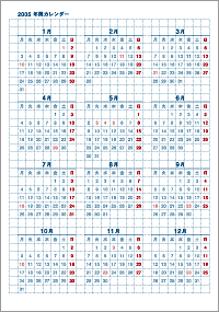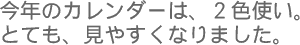 これまで年間カレンダー、年間予定表、月間カレンダーは、 1色づかいで、平日・休日・祝日、それぞれの区別は、 印刷色の濃淡で表現しておりました。 でも、これだと、ぱっと見た瞬間に、 平日・休日・祝日の差があまりわからない‥‥ ということがちょっとした弱点でもありました。 そこで‥‥! それぞれのカレンダーページを もっと快適にご活用いただくべく、 2005年版からは、 平日・休日・祝日の違いがひと目でわかるように、 休日と祝日は、「赤」系の色にしました! とくに、年間カレンダー、年間予定表は、 この2色使いにしたことによって、 想像以上に、見やすくなっておりますよ! 実際に、このことによって、 使い勝手もグンとアップすると思います。