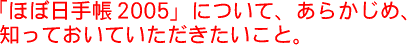 このたびは、「ほぼ日手帳2005」のご購入を ご検討くださり、ありがとうございます。 「ほぼ日手帳2005」では、 実際にみなさまのお手もとに届いたときに、 よりご満足していただくために、 ここでは、あえて、「ほぼ日手帳2005」の ややマイナス的なお知らせをしております。 ご購入の際には、このような要素も含めて ご検討いただければさいわいです。 なにとぞ、よろしくお願いいたします。