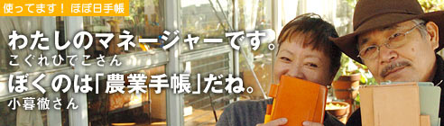 「ほぼ日手帳」は、マネージャー。 来年も、人を雇わなくてすみます。 (こぐれひでこさん) ぼくのは、うちの菜園で獲れた収穫物を書いてるから、 「農業手帳」だな。 (小暮徹さん)