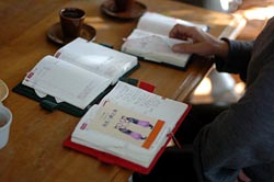 ご存知、ひでこさんの『ごはん日記』は、 かれこれ、連載期間が5年ちかくにもおよぶそうです。 「そんな毎日、いいもんばっかり食べてないですよ。 おせんべい2枚ですませるときもあるし・・・・ そういうときも、ありのまま載せてます。」 とおっしゃるひでこさん。 ちなみに、この日の朝食は、 とおるさん手作りの豆乳をつかって、 “豆乳なべ”を食べたそうです。 ご夫婦で、交代で味付けをしたりして、 とっても仲良しなお二人の手帳談義は、さらにつづきます。