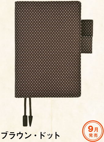上品なダークブラウンに、 小さな白い水玉をあしらった、 清楚で、かわいらしい雰囲気を持ったカバーです。 デスクになにげなく置いてあったら、 なんだか好感度アップしそうなデザインです。 (※A5サイズの「カズン」のカバーもあります。)