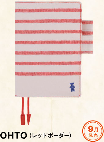 「やさしいタオル」で大人気の 「OHTO(オホト)」シリーズから、 「レッドボーダー」をカバーのプリントにしました。 素材感のある赤いボーダーに、赤いステッチ、 ネイビーのくまのワンポイントが入って、 持っているだけでたのしくなる、かわいいカバーです。