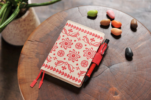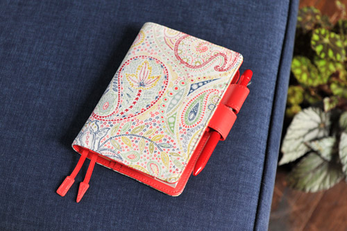 インド柄に挑戦していただきました。 どういう思いでつくられたんでしょう? 日下部 独自の伝統柄の宝庫であるが故に ――― いろんなモチーフがちりばめられていて、 日下部 はい。インドの様々な模様の中から ――― 柄もかわいくて、色も明るいのに 日下部 インドの伝統柄のはなやかな ――― みなさんに一言お願いします。 日下部 毎日使う手帳カバーとしては ――― ありがとうございました。 |