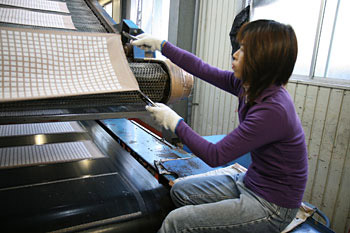 ▲捺染の機械から染めたばかりのタオルを取り出すときは、