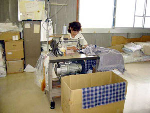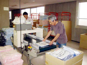 検品とタオルをたたむ作業は、2人1組で行われます。