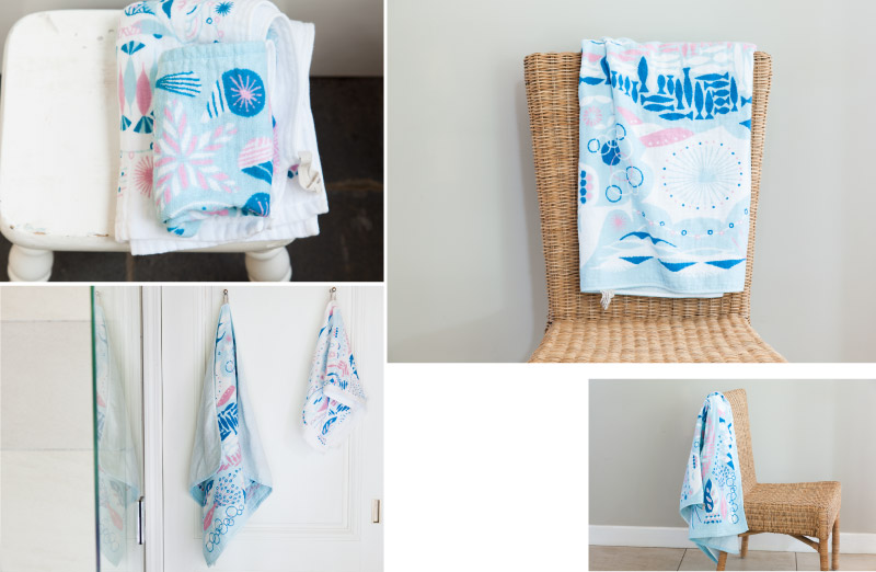 タオルの海を元気に泳ぎ回るたくさんの魚、