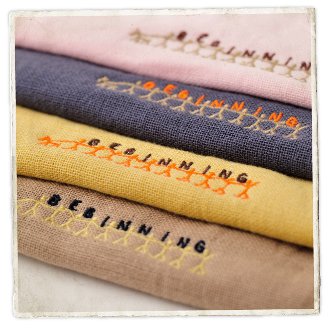 の、4つの色のラインナップ。 それぞれ、アンリ・ベグランさんによる かわいらしいシンボルマークを、 刺繍で入れました。 |