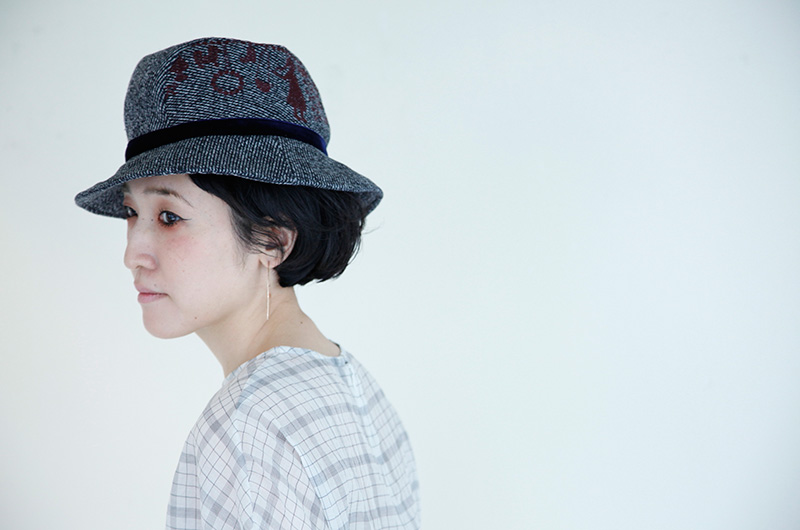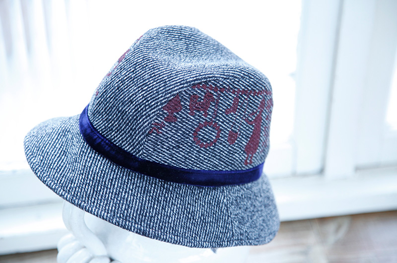 えんじ色の繊細な刺繍を施した中折れ帽です。