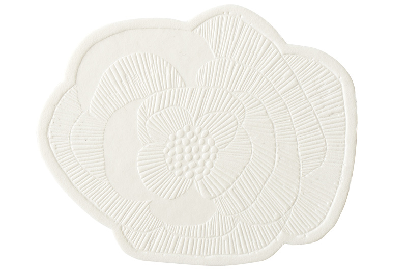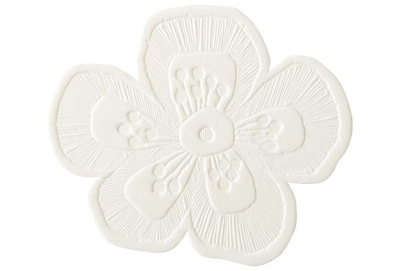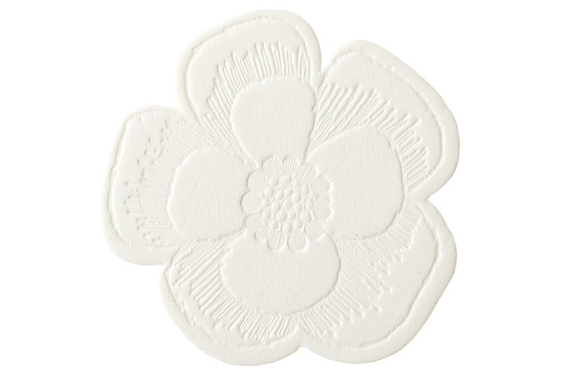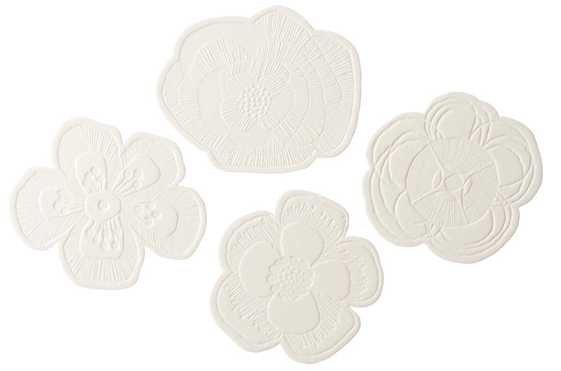 白い花が、4輪。 このコースターの名前は「rosetta」です。 コースターとはいいながら、 インテリアにも使えるのがこの花たち。 たとえば白い壁に、 ちょっと浮かせて貼ってみると、 おしゃれな空間になるんですよ。 もちろん、グラスやカップをのせても、 ちゃんと使えます。