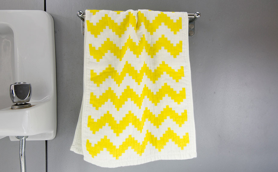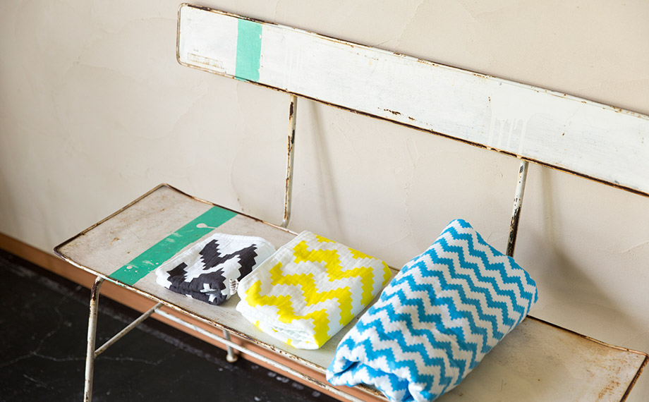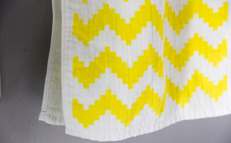 こまかな正方形をならべて、幾何学的に波形紋をえがきました。