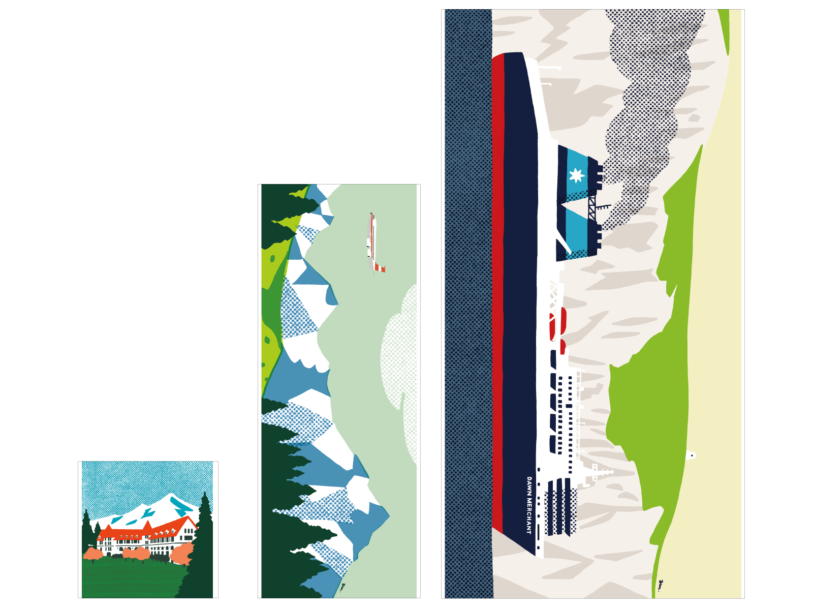 ハンドタオルは、山のホテルを描いたもの。