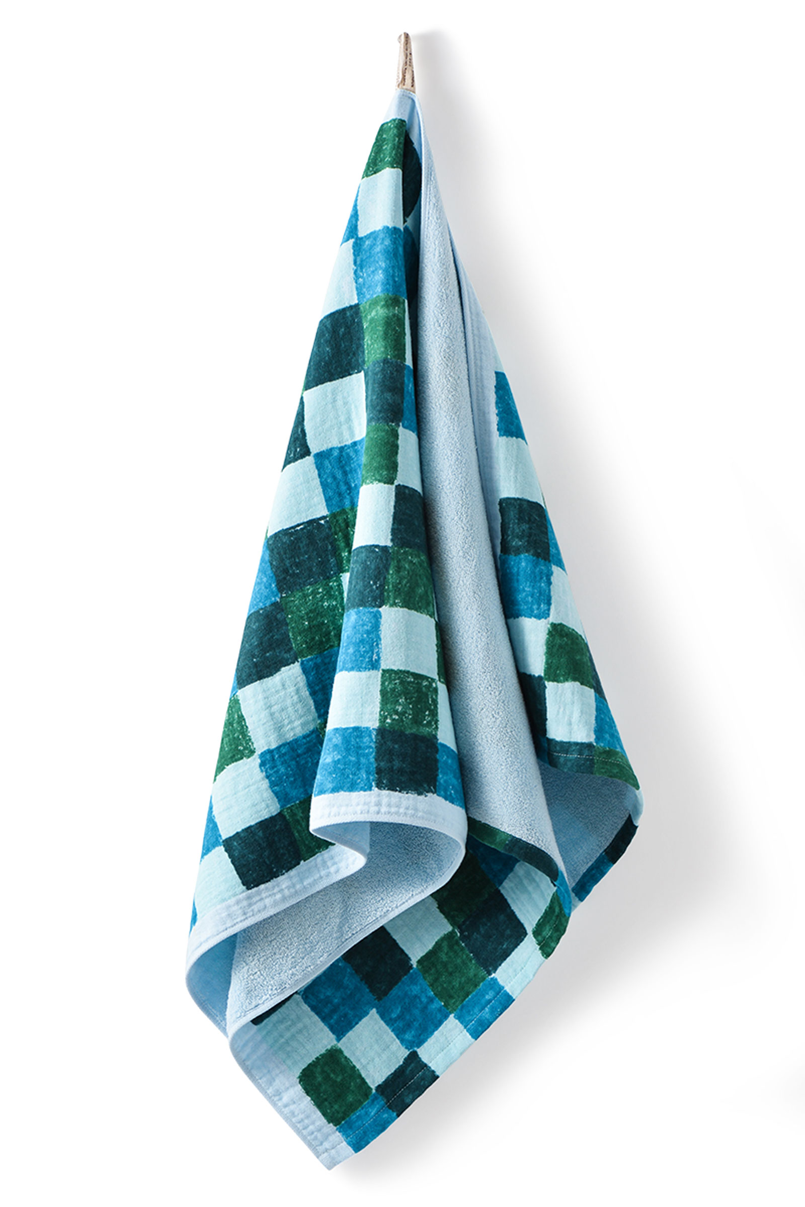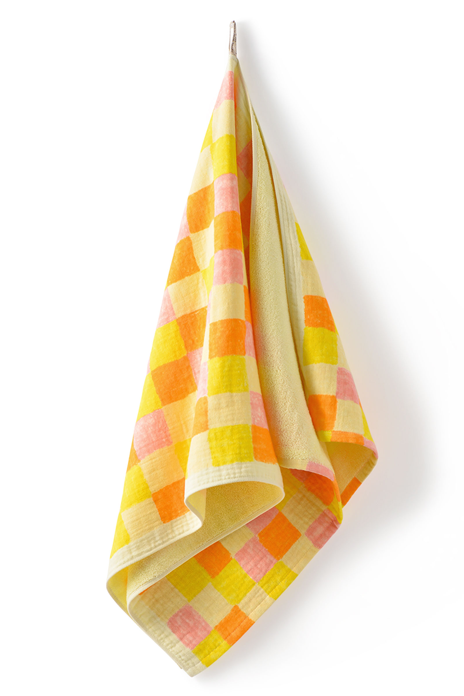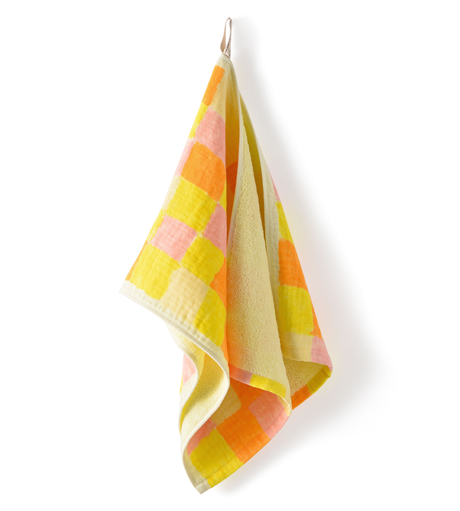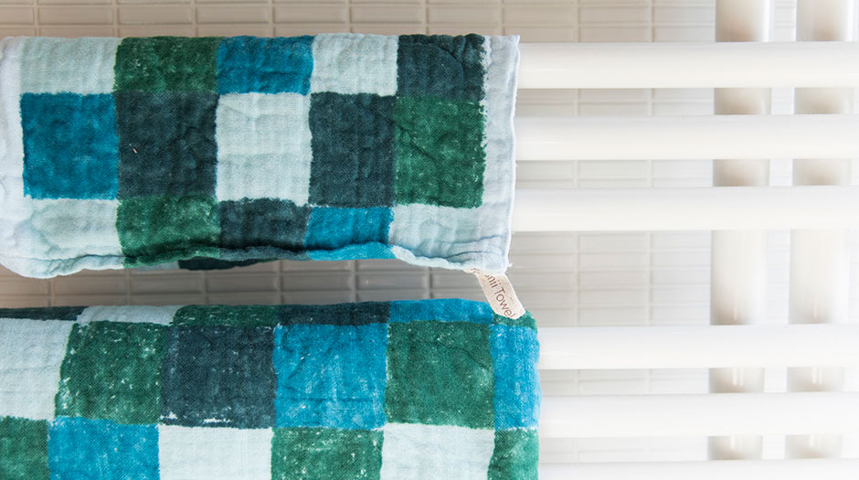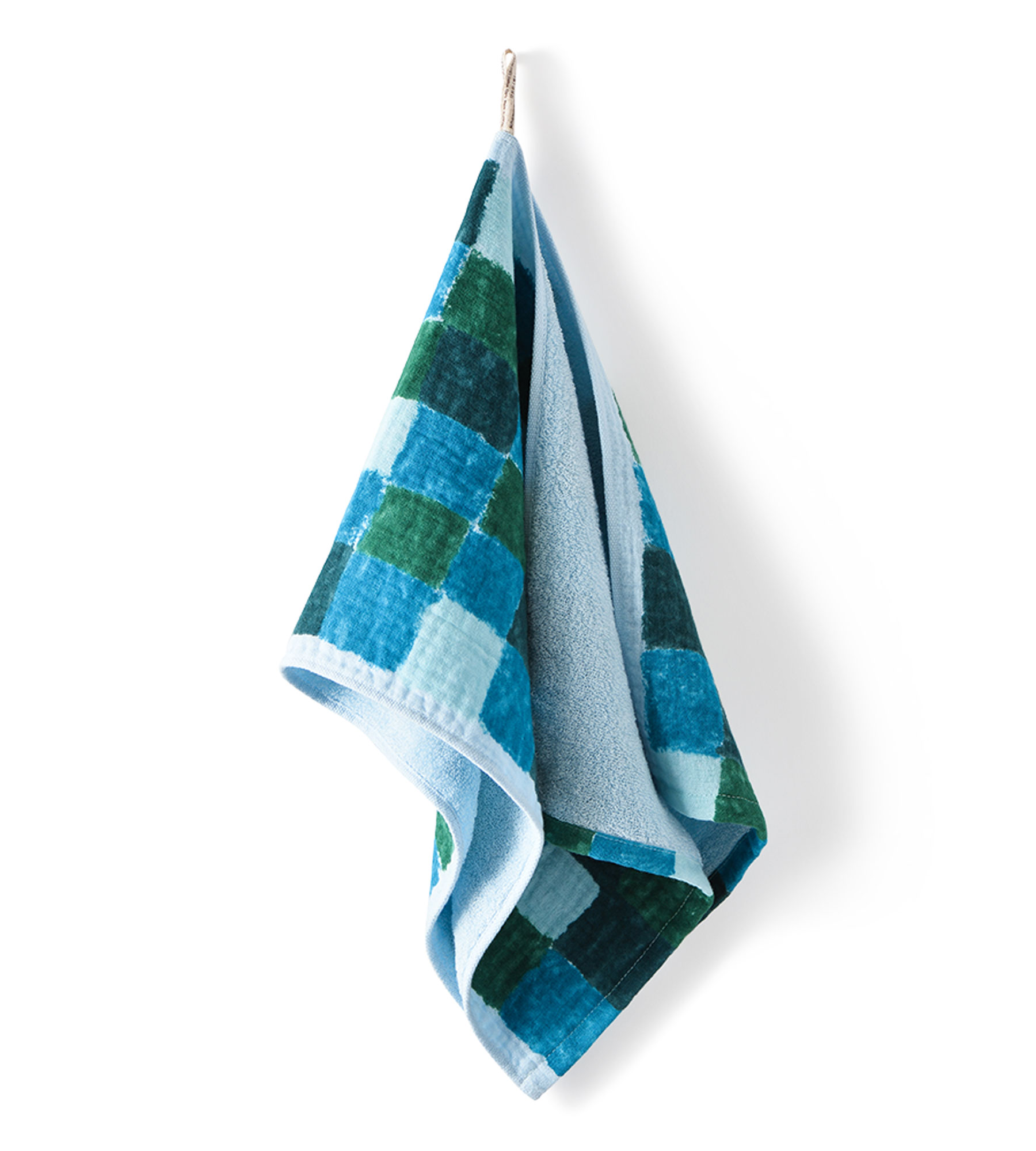 黄色を基調とした『太陽』と、 青・緑を基調にした『森』。 プリントでチェックを表現した 2色のタオルです。 ヨーロッパの石畳、あるいは 飛行機から見えるうつくしい遠景の大地のよう。 白で織ったタオルを製品染めしたあと、 パステルで手描きしたブロックチェックを ガーゼ面いっぱいにプリントしました。 北欧で使われる毛布や インテリア・ファブリックのような やわらかい印象があります。 サイズはハンド・フェイス・バスの3種類です。